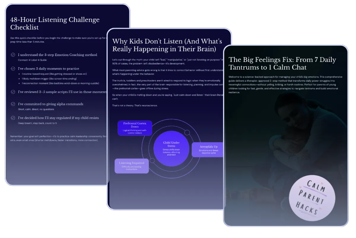 It's a done-for-you listening system that helps your child calm down, listen the first time, and move on — without yelling, bribing, or power struggles. Inside, you’ll follow a simple 3-step Calm Chat Formula plus a 48-Hour Listening Challenge that shows fast, real change. You'll get; exact words to say (scripts), a clear process to follow, tools you can use in the moment. No fluff. No theory dumps.